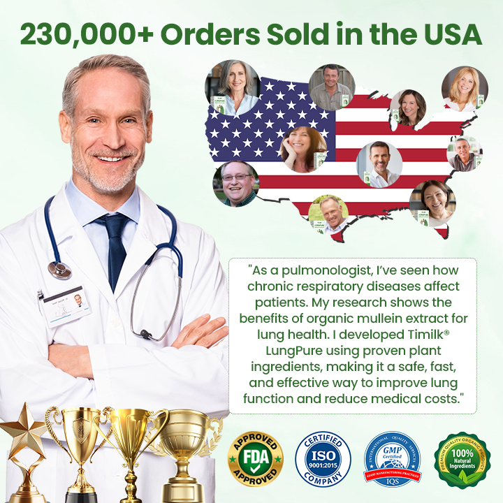 „Pulmonológusként láttam a krónikus légzőszervi megbetegedésekkel járó küzdelmeket. A közelmúltban végzett kutatásom rávilágított a szerves muharfű-kivonat tüdőfunkcióra gyakorolt erőteljes hatására. A bevált növényi alapú összetevők kombinálásával kifejlesztettem a Timilk® LungPure-t, a krónikus légúti problémák hatékony megoldását. Nagyon ajánlom, mivel gyors, biztonságos és nem invazív módon javítja a tüdő egészségét, és megtakarítja az orvosi költségeket.”